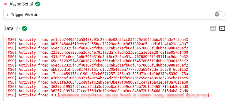 32.04 microseconds is equivalent to a bit rate of around 32230 bits/second. Once the Async Serial analyzer properly configired, we can jump to the Terminal tab to see the ASCII strings that transitted on the line: